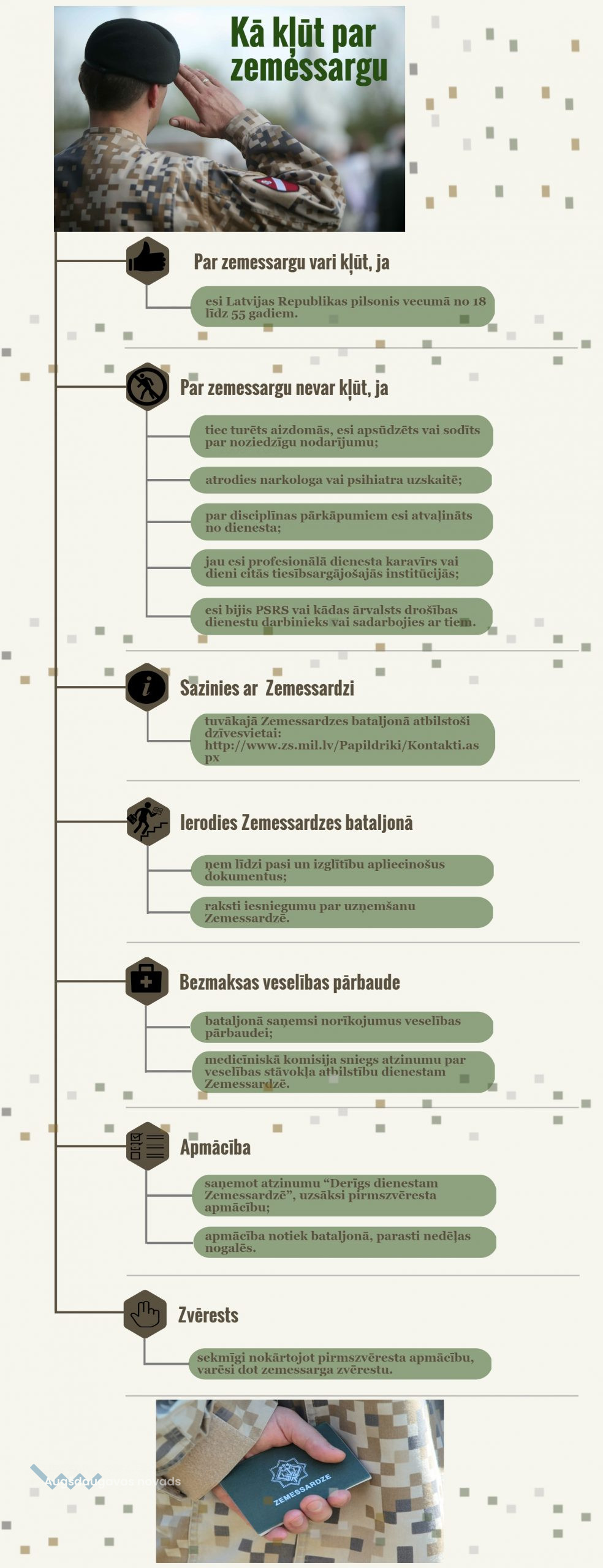 Zemessardzē uzņem Latvijas Republikas pilsoņus, kuri sasnieguši 18 gadu vecumu, bet nav vecāki par 55 gadiem, un vēlas dienēt Zemessardzē. Lai iestātos Zemessardzē, jāsazinās ar dzīvesvietai tuvāko Zemessardzes bataljonu un jāsaņem tālākos norādījumus. Informācija par prasībām uzņemšanai Zemessardzē ir atrodama Zemessardzes mājas lapas www.zs.mil.lv sadaļā – Prasības uzņemšanai Zemessardzē. Tur atrodama arī Zemessardzes bataljonu kontaktinformācija.