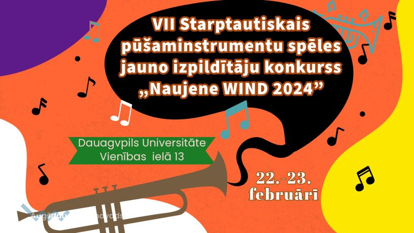 22.-23. februārī Daugavpils Universitātē norisināsies VII Starptautiskais pūšaminstrumentu spēles jauno izpildītāju konkurss “Naujene WIND 2024”, ko rīko Naujenes Mūzikas un mākslas skola sadarbībā ar Augšdaugavas novada Kultūras pārvaldi un Daugavpils Universitāti. Konkurss tiek rīkots ar mērķi veicināt pūšaminstrumentu spēlesjauno izpildītāju profesionālo izaugsmi un attīstību, popularizēt Augšdaugavas novada, Naujenes pagasta kultūrvides aktivitātes un atpazīstamību Latvijā un … Continue reading Notiks starptautisks konkurss „Naujene WIND 2024”