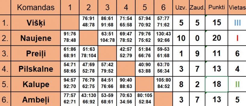 Vispirms laukumā devās Ambeļu un Preiļu komandas, no šīs spēles iznākuma bija atkarīgs, kura no komandām ieņems piekto un kura sesto vietu. Šajā spēlē uzvaru ar rezultātu 68:61 un piekto vietu izcīnīja Ambeļu komanda.