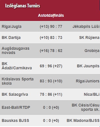 Reģionālajā Basketbola līgā sākušās astotdaļfināla spēles, kurās sava starpā tiekas Rietumu un Austrumu grupas komandas atbilstoši ieņemtajām vietām pamatturnīrā. Divu spēļu summā tiek noskaidrots uzvarētājs, kurš turpinās cīnīties ceturtdaļfinālā, savukārt zaudētājai komandai turnīrs būs beidzies.