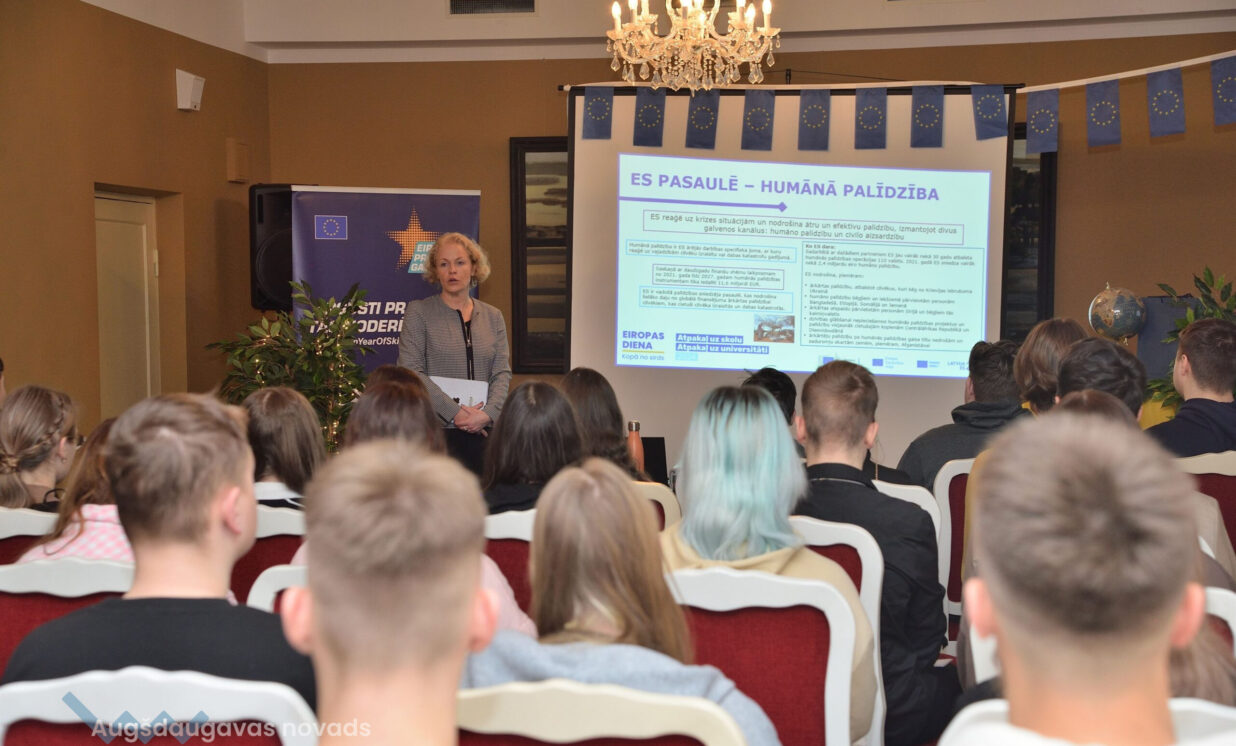 EUROPE DIRECT Dienvidlatgales centra vadītājs Oskars Zuģickis stāsta, ka Eiropas Komisijas pārstāvniecība Latvijā jau 16 gadus organizē aktivitāti “Atpakaļ uz skolu / Atpakaļ uz universitāti ar mērķi ļaut skolu jauniešiem izbaudīt pieaugušu cilvēku klātbūtni savās stundās, dzirdēt viņu pieredzi, kas jauniešiem var noderēt tālākajā dzīvē. “Ja pērn galvenais akcents bija motivēt jauniešus dzīvei ar dažādām aktivitātēm, tad šogad mēs aicinām pieaugušos cilvēkus nākt pie jauniešiem uz skolu un vadīt stundas, iejusties skolotāja lomā. Arī šodien Vienības nams ir pārtapis par lielāko skolu Latvijā, varbūt pat Eiropā. Ļoti ceram, ka šī akcija aizies tālāk gan Augšdaugavas novadā, gan visā Latgalē un Latvijā kopā.”