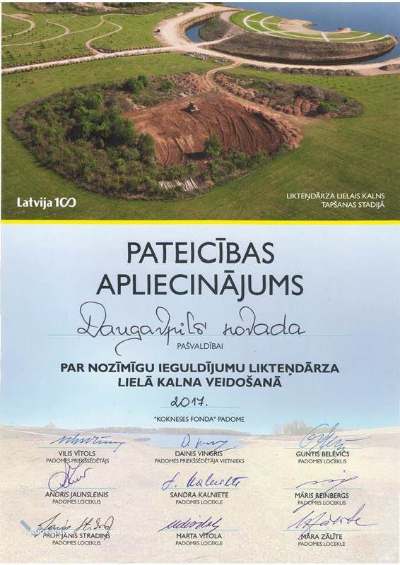 NovadsAktualitātesJaunumiNovada pašvaldībai pasniegts Pateicības apliecinājums par ieguldījumu Likteņdārza Lielā kalna izveidei