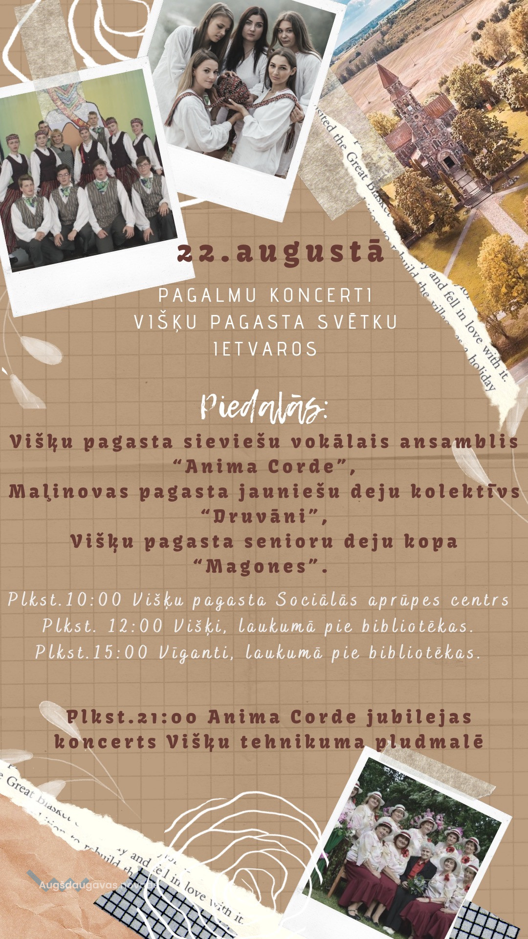 Višķu pagasta svētku ietvaros 2020. gada 22. augustā Višķu pagastā notiks pagalmu koncerti. Plkst. 10.00 – pagalmā pie Višķu sociālās aprūpes centra “Rūpes”; Plkst. 12.00 – laukumā pie Višķu bibliotēkas; Plkst. 15.00 – laukumā pie Vīgantu bibliotēkas. Koncertos piedalīsies: Višķu pagasta sieviešu vokālais ansamblis “ANIMA CORDE”, vadītāja Agate Jermaļonoka; Maļinovas pagasta jauniešu deju kolektīvs “DRUVĀNI”, vadītāja Antra Dombrovska; Višķu pagasta senioru deju kopa “MAGONES”, vadītāja Marija Šaršune. Plkst. 21.00 “ANIMA CORDE” jubilejas koncerts Višķu tehnikuma pludmalē