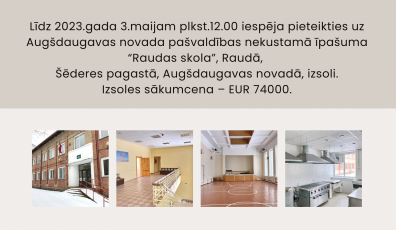 Nekustamo īpašumu izsoles25.04.2023Iespēja pieteikties uz Augšdaugavas novada pašvaldības nekustamo īpašuma “Raudas skola” izsoli Lasīt vairāk