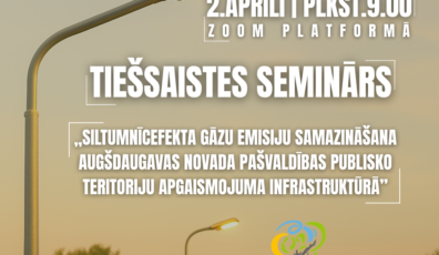 Pašvaldība17.03.2025Seminārs „Siltumnīcefekta gāzu emisiju samazināšana Augšdaugavas novada pašvaldības publisko teritoriju apgaismojuma infrastruktūrā” Lasīt vairāk