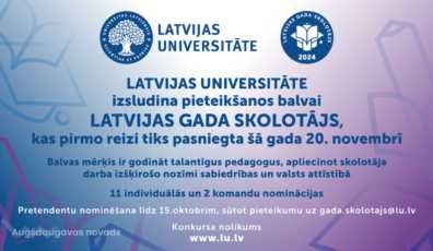 AKTUĀLI12.09.2024Latvijas Universitāte aicina nominēt “Latvijas Gada skolotājs” balvas pretendentus Lasīt vairāk