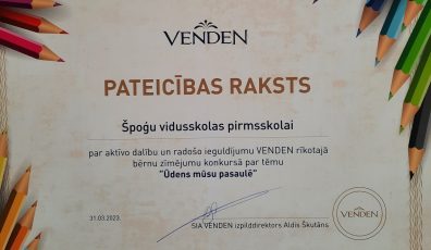 Izglītība09.06.2023Špoģu vidusskolas pirmsskolas izglītojamie lepojas ar sasniegumiem zīmējumu konkursā “Ūdens mūsu pasaulē” Lasīt vairāk
