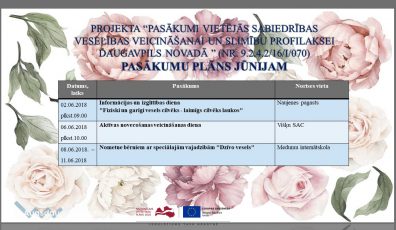 Sociālais darbs un veselība04.06.2018Veselības veicināšanas projekta pasākumu plāns jūnijam Lasīt vairāk