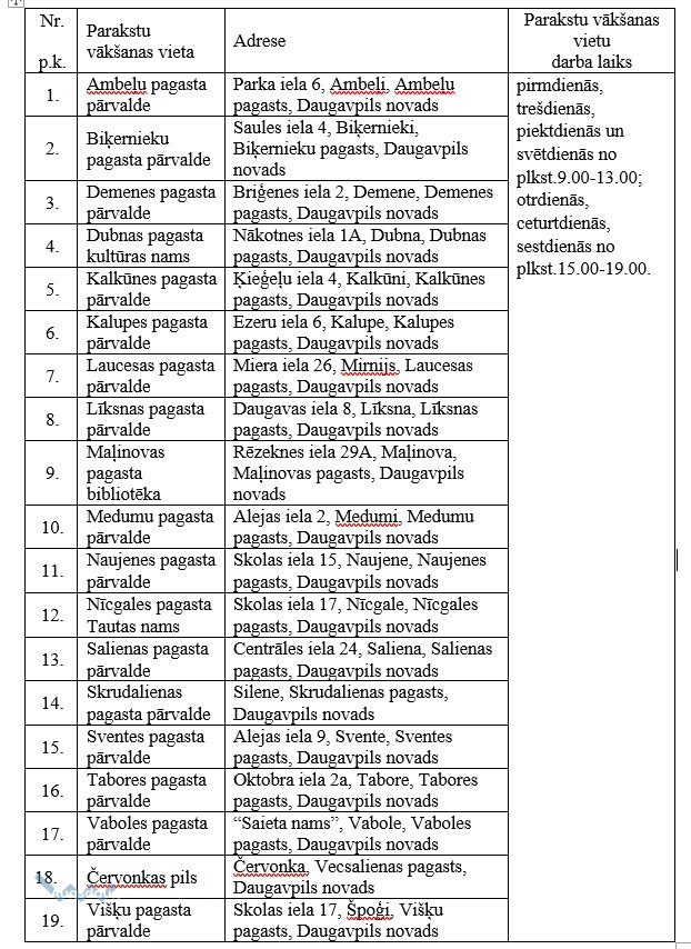 Daugavpils novada administratīvajā teritorijā noteiktas 19 parakstu vākšanas vietas, lai nodrošinātu parakstu vākšanu tautas nobalsošanas ierosināšanai par apturēto likumu “Grozījumi Republikas pilsētas domes un novada domes vēlēšanu likumā” un likumu “Grozījums likumā “Par pašvaldībām””