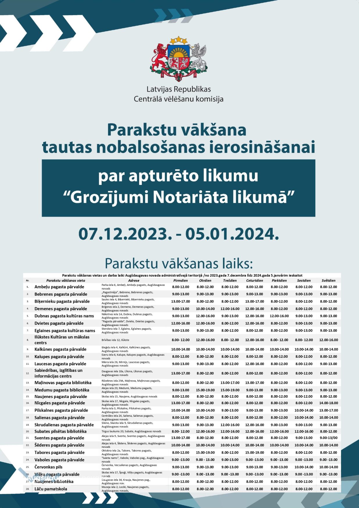 Augšdaugavas novada pašvaldības teritorijā šim procesam ir noteiktas 28 parakstu vākšanas vietas. Noteiktais darba laiks skatāms tabulā. Tas ir valsts budžeta finansēts pasākums un iedzīvotājiem par to nav jāmaksā. Ja vēlētājs vēlas parakstīties parakstu vākšanas lapā, bet veselības stāvokļa dēļ nevar ierasties parakstu vākšanas vietā, vēlēšanu komisija, pamatojoties uz šā vēlētāja vai viņa pilnvarotas personas rakstveida iesniegumu, organizē parakstu vākšanu vēlētāja atrašanās vietā. Iesniegums ne vēlāk kā līdz 4. janvāra plkst. 12.00 nogādājams attiecīgajai vēlēšanu komisijai vai parakstu vācējam (vēlēšanu komisijas noteiktajā darba laikā). Parakstu vākšanu vēlētāju atrašanās vietās vēlēšanu komisija organizēs 5. janvārī .