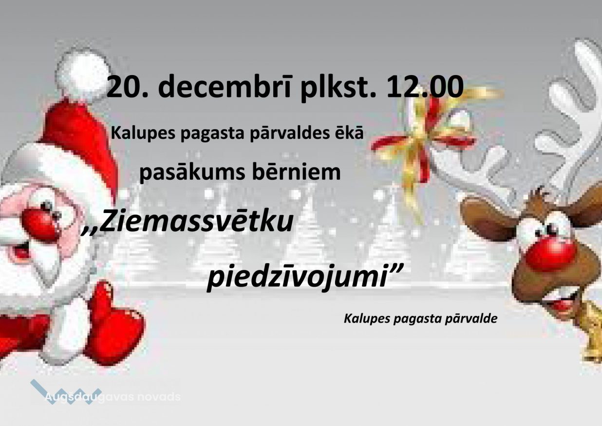 20.decembrī, plkst. 12:00, Kalupes pagasta pārvaldes ēkā norisināsies pasākums bērniem "Ziemassvētku piedzīvojumi", informē Kalkūnes pagasta pārvalde