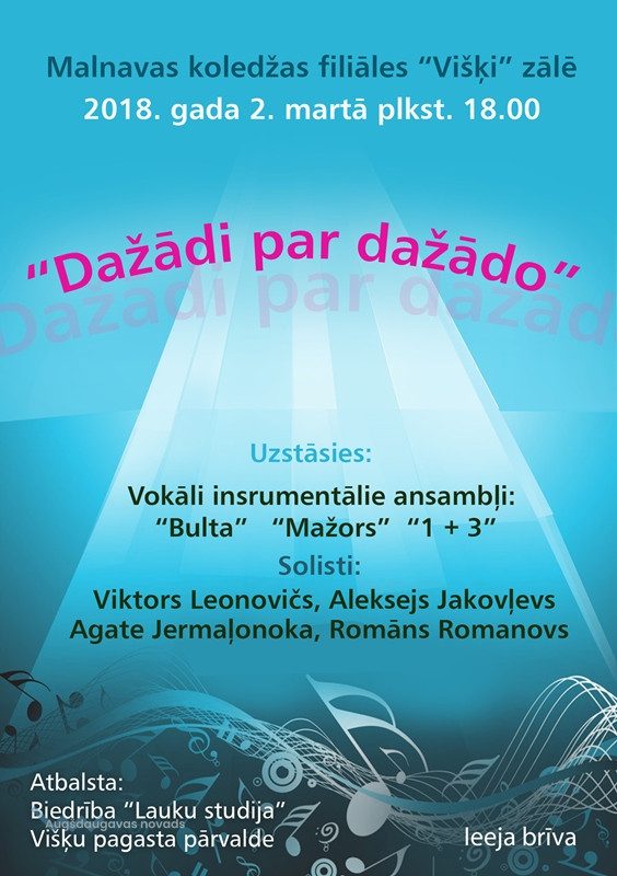2. martā plkst.18.00 visi mūzikas cienītāji tiek aicināti uz pasākumu "DAŽĀDI PAR DAŽĀDO"! Pasākums notiks Višķu pagasta sabiedriskajā centrā - Malnavas koledžas filiāles "Višķi" zālē. Pasākuma programmā Vokāli instrumentālo ansambļu koncerts. Ar saviem priekšnesumiem uzstāsies VIA "Bulta", "Mažors" un "1+ 3". Vokāli instrumentālā ansambļa pavadījumā baudīsim solistu - Viktora Leonoviča, Alekseja Jakovļeva, Agates Jermaļonokas un Romāna Romanova skanīgās balsis.