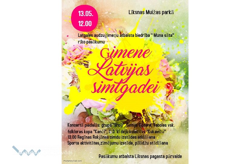 13. maijā plkst. 12.00 Līksnas Muižas parkā Latgales audžuģimeņu atbalsta biedrība "Muna sāta" aicina uz pasākumu "Ģimene Latvijas simtgadei".