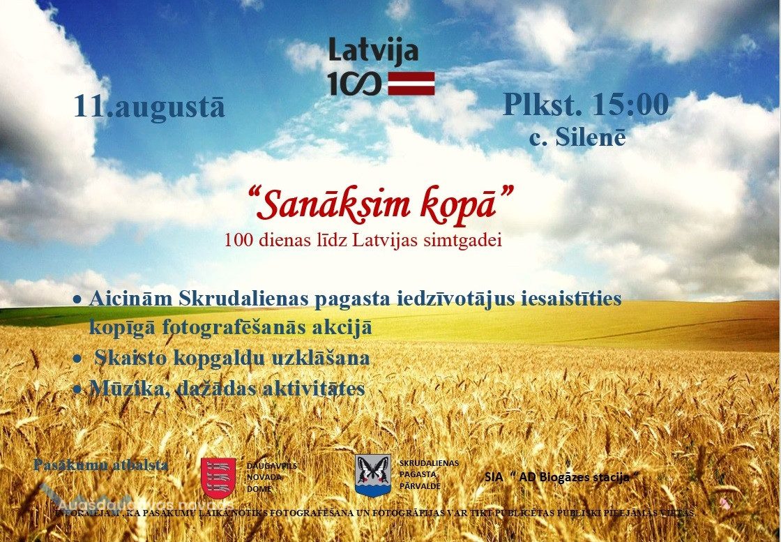 Pasākums “Sanāksim kopā” Skrudalienā07.08.2018AKTUĀLI 11. augustā plkst. 15:00 Silenes ciemā Skrudalienas pagasta iedzīvotāji aicināti iesaistīties kopīgā fotografēšanās akcijā. Pasākumā "Sanāksim kopā" tiks atzīmētas 100 dienas līdz Latvijas simtgadei ar skaistu kopgaldu, mūziku un citām aktivitātēm.