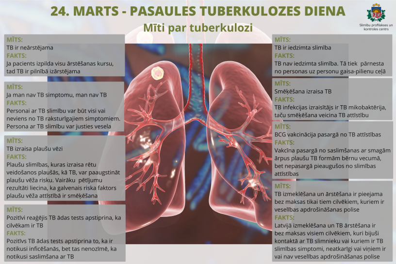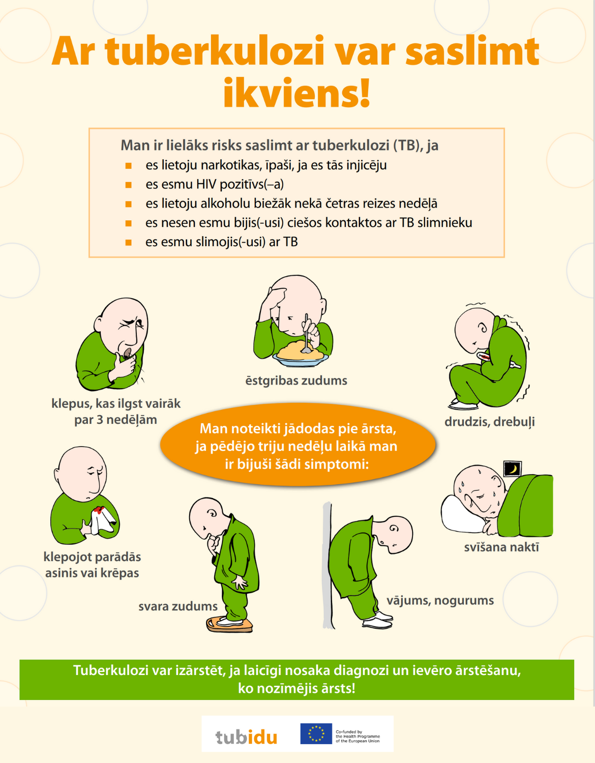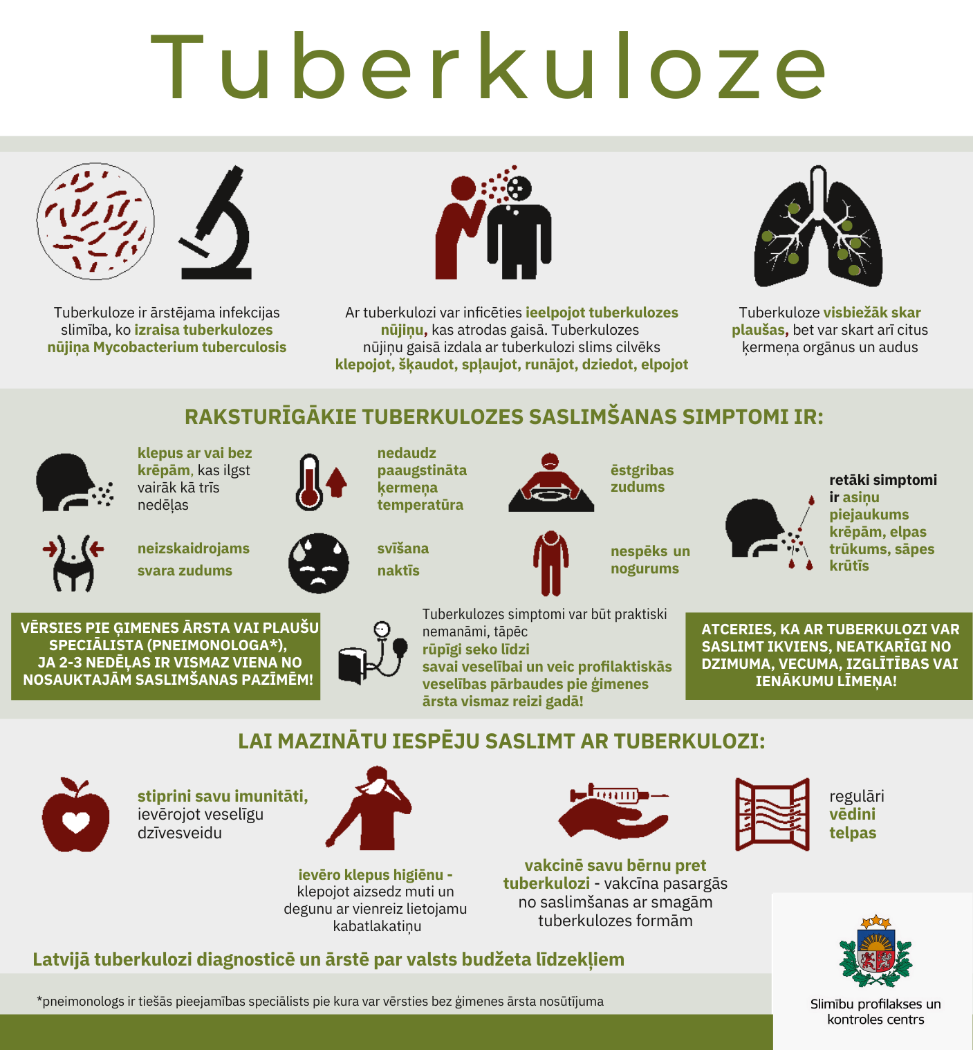 Lai atgādinātu iedzīvotājiem par tuberkulozes profilaksi, simptomiem un ārstēšanas iespējām, Slimību profilakses un kontroles centra speciālisti ir sagatavojuši vairākus vizuālos materiālus, ko aicinām izvietot savos komunikāciju kanālos. Materiālus un to iespējamos pavadošos tekstus atradīsiet e-pasta pielikumā.