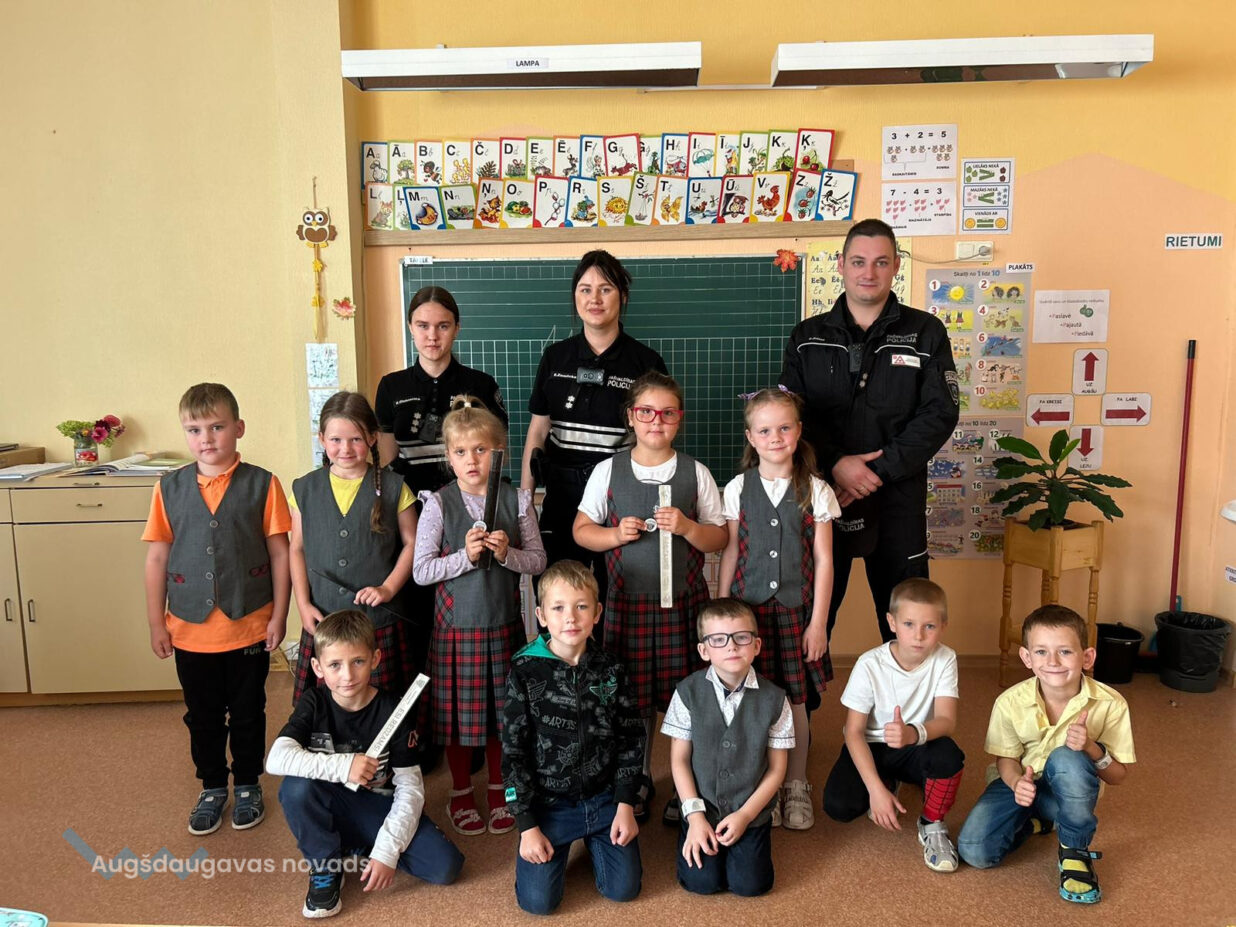Nobeigumā skolēni saņēma atstarotājus, lai tumšajā diennakts laikā vienmēr būtu pamanāmi uz ceļa, kā arī nozīmītes ar pašvaldības policijas emblēmu.