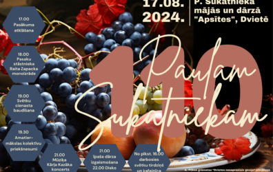 17. augustā Paula Sukatnieka mājās un dārzā “Apsītes”, Dvietē “Paulam Sukatniekam 110” Pasākuma programma:17.00 Pasākuma atklāšana18.00 Pasaku stāstnieka Raita Zapacka uzstāšanās19.00 Svētku cienasta baudīšana19.30 Amatiermākslas kolektīvu priekšnesumi21.00 Mūziķa Kārļa Kazāka koncerts21.00 Dārza izgaismošana īpašās noskaņās22.00 Disko balle No plkst. 16.00 darbosies svētku tirdziņš un kafejnīca.
