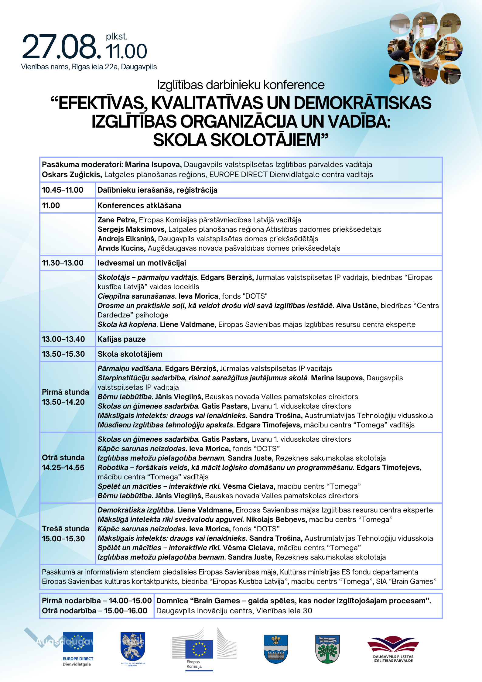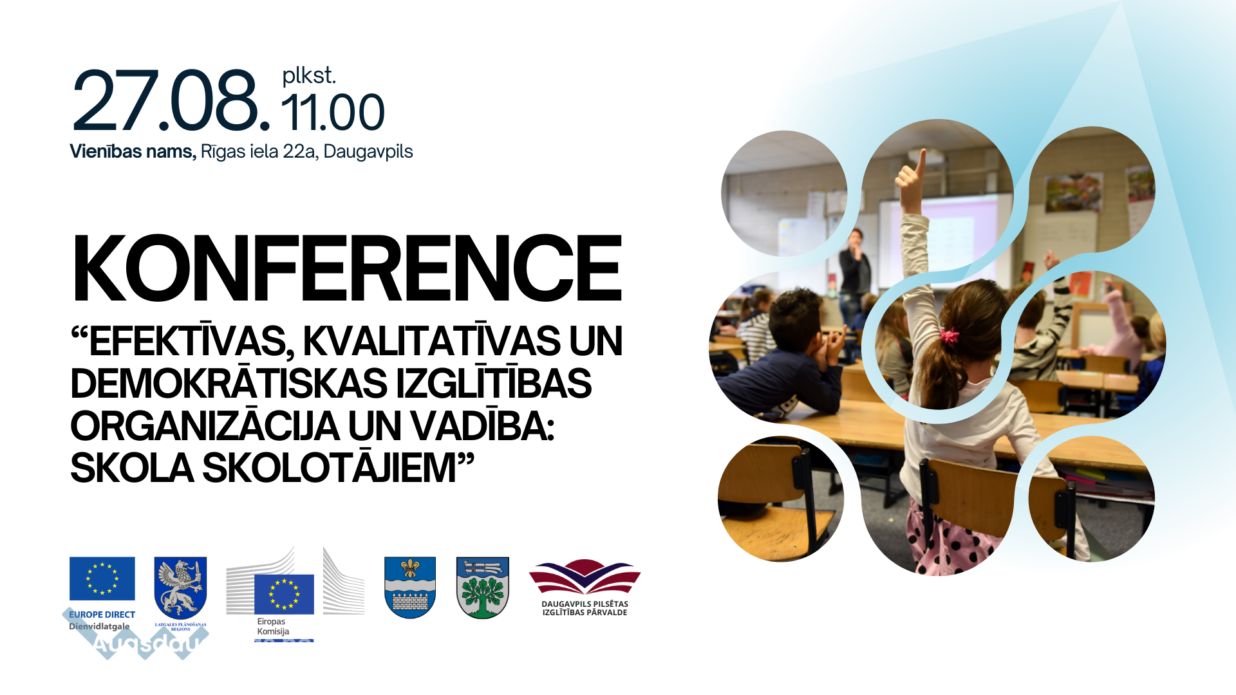 EUROPE DIRECT Dienvidlatgale centrs, Eiropas Komisijas pārstāvniecība Latvijā un Daugavpils valstspilsētas un Augšdaugavas novada pašvaldības Izglītības pārvaldes 2024. gada 27. augustā Vienības namā (Rīgas iela 22a, Daugavpils) aicina izglītības nozares darbiniekus uz konferenci “Efektīvas, kvalitatīvas un demokrātiskas izglītības organizācija un vadība: skola skolotājiem”.