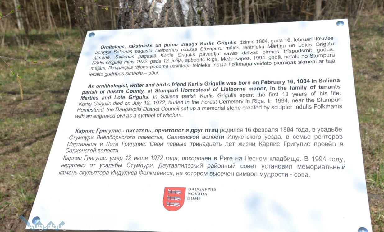 Rakstnieks, ornitologs Kārlis Grigulis, kuram šogad tiek atzīmēta 135. gadadiena, dzimis un pirmos 13 bērnības gadus pavadījis Daugavpils novada Salienas pagastā. Salienas pagasta iedzīvotāji lepojas ar novadnieku, katru gadu rīkojot Putnu dienas, kas veltītas talantīgajam putnu pazinējam. Kārlis Grigulis ir vairāku grāmatu autors, viņš bija biežs un gaidīts viesis skolās, kur bērni ar lielu aizrautību klausījās Griguļtēva stāstos un mācījās novērot dabu un putnus.