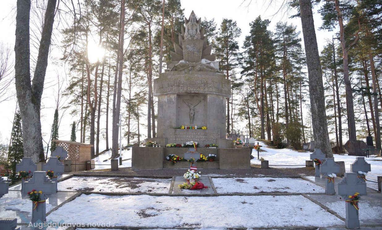6,5 m augstais piemineklis celts 1932. gadā par Lietuvas valsts līdzekļiem, pieminekli vainago jaunavas figūra — Lietuvas simbols, kas tur rokās plāksni ar Sv. Jura bareljefu, pie tās kājām kritis karavīrs ar šauteni blakus. Apakšā centrā krustā sistā Kristus tēls. Pieminekli veidoja lietuviešu skulptors Stasis Stanišauskas. Uz tā ir redzams uzraksts: “Lietuvas kritušiem karavīriem.” Un tālāk lietuviešu valodā: “Ceļiniek, pasaki Lietuvai, ka mēs kritām, Tēviju aizstāvēdami.”