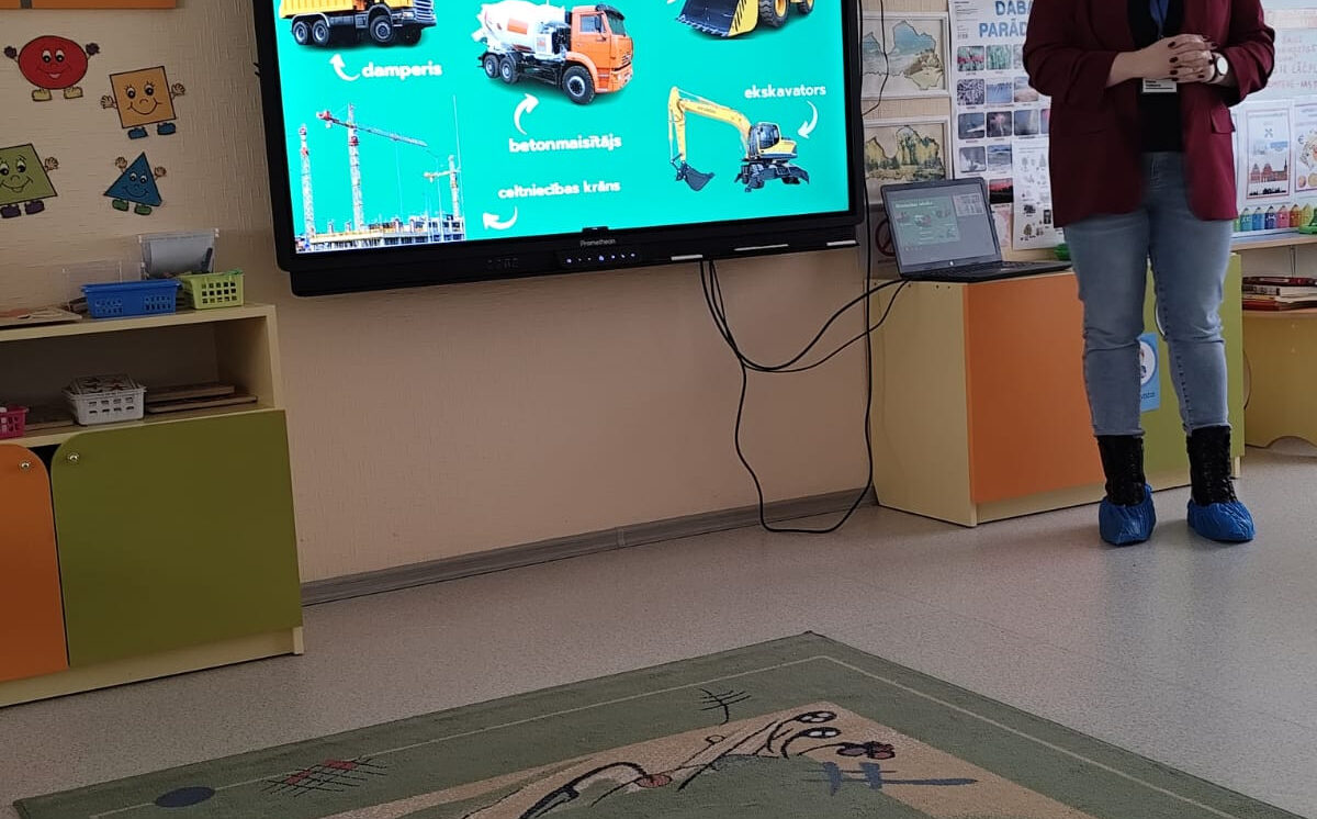 Tālāk sekoja vizuāli bagāta prezentācija par ēku attīstības vēsturi – ceļojums no senām, vienkāršām būvēm līdz mūsdienu iespaidīgajām augstceltnēm. Bērni iepazinās ar dažādiem būvmateriāliem, to īpašībām un nozīmi drošā būvniecībā. Tika demonstrēts arī būvniecības aprīkojums – ķiveres, drošības vestes, instrumenti – un būvniecības tehnika, piemēram, ekskavators un celtnis. Mazajiem dalībniekiem tas raisīja lielu interesi, jo viņi varēja tuvāk aplūkot priekšmetus, kas ikdienā redzami tikai no attāluma.