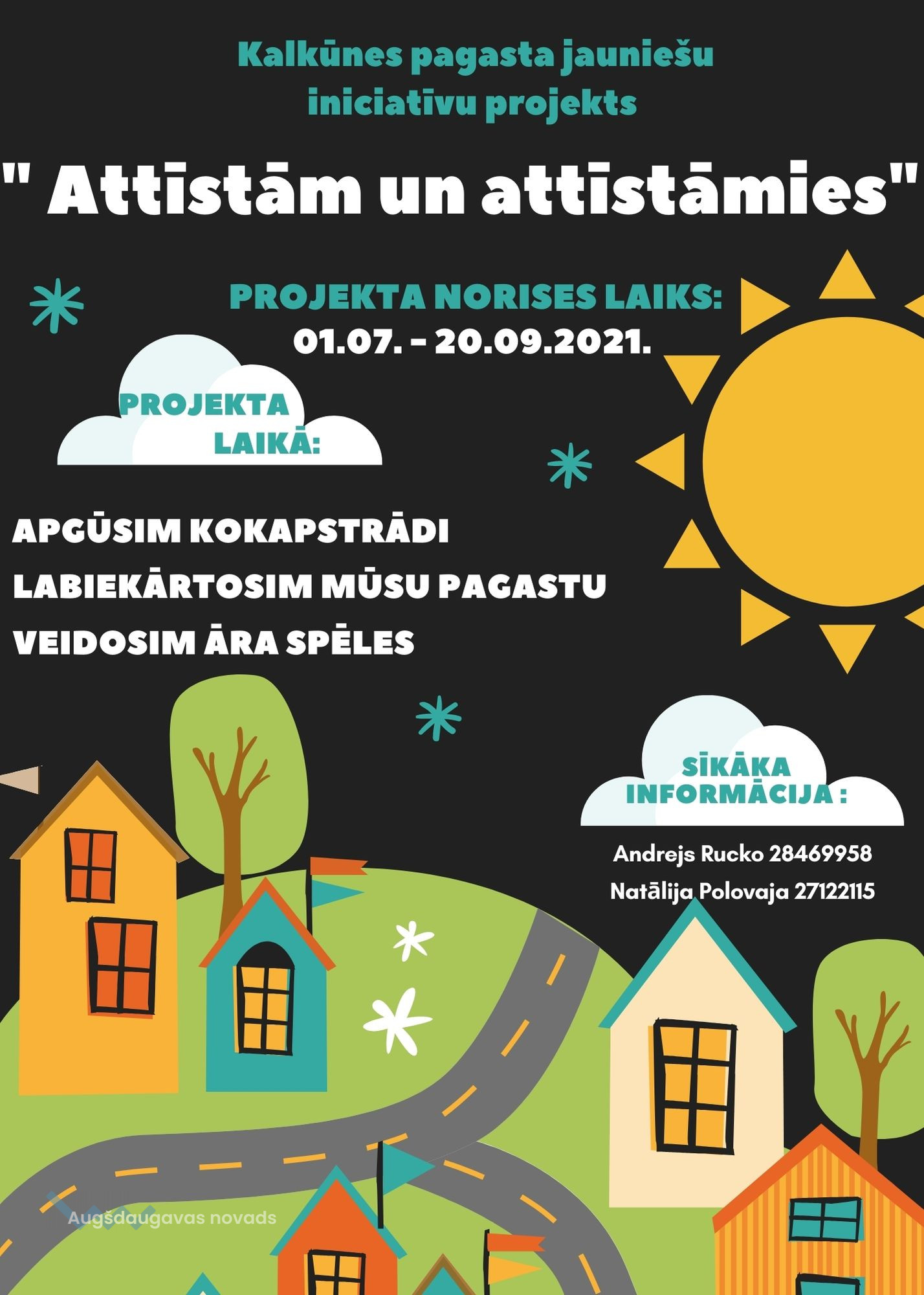 Jauniešu projekta “Attīstām un attīstāmies” mērķis ir attīstīt un pilnveidot jauniešu prasmes kokapstrādē, iesaistīt jauniešus sava pagasta teritorijas labiekārtošanā un veicināt jauniešu iesaisti neformālās izglītības aktivitātēs. Projekta laikā projekta dalībnieki veidos dažāda veida āra spēles no koka – attīstošās, pāru, komandas, individuālās, lielformāta. Šīs spēles projekta noslēgumā tiks dāvinātas Kalkūnes pagasta bērniem, un būs publiski pieejamas bērnu rotaļu laukumos, īpaši tām uzstādītajos rotaļu skapīšos. Projekts tiek īstenots no 01.07. un ilgs līdz 20.09. Projektā var piedalīties ikviens Kalkūnes pagasta jaunietis vecumā no 13 līdz 25 gadiem.