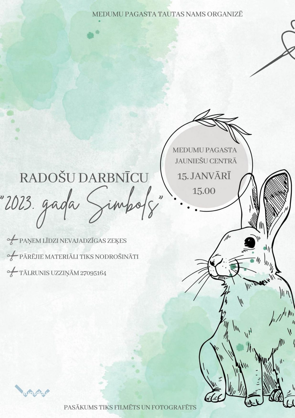 15. janvārī, pulksten 15.00 Medumu pagasta Jauniešu centrā (Alejas ielā 13, Medumos) visi laipni aicināti piedalīties mūsu radošajā darbnīcā “2023. gada Simbols”. Parunāsim par Jaunā gada simbolu. Kā arī katrs sev vai dāvanā sašūs mīksto rotaļlietu Zaķīti. Lūgums līdzi paņemt nevajadzīgs, tīras zeķes. Viss pārējais materiāls tiks nodrošināts. Piedalīšanās tikai pēc iepriekšējā pieraksta pa tālr. 27095164.