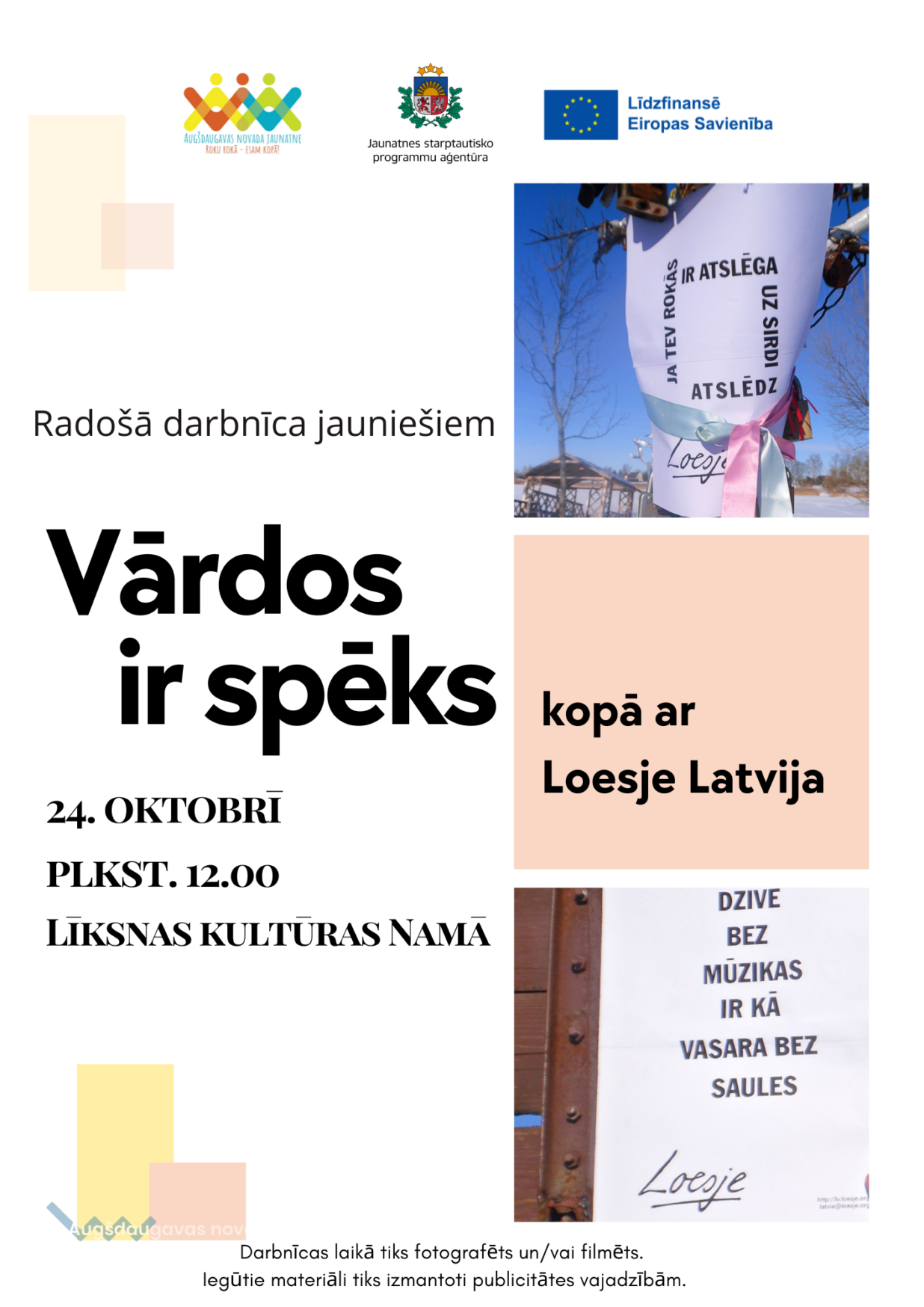Aicinām Līksnas, Vaboles, Kalupes un Nīcgales jauniešus piedalīties "Loesje Latvija" radošās rakstīšanas darbnīcā 24. oktobrī, Līksnas kultūras namā, plkst. 12.00, kurā iepazīsim Loesje plakātu veidošanas kustību, tās vērtības un koprades spēku! Darbnīcas laikā uzzināsi, kā veidot iedvesmojošus saukļus un kā šo metodi izmantot, lai paustu savu viedokli un iedvesmotu citus. Kopā ar citiem dalībniekiem radīsim tekstus, kas tiks izmantoti Loesje plakātos.
