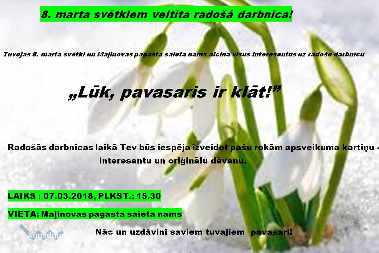 7. martā plkst. 15:30 Maļinovas pagasta saieta nams aicina uz radošo darbnīcu, lai radītu sev un tuvajiem pavasara noskaņu!