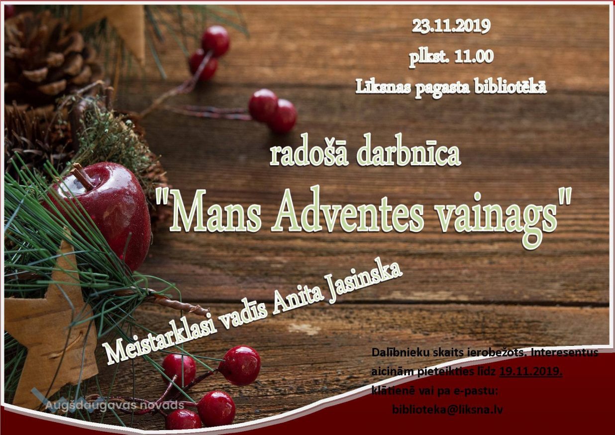 23.11.2019 plkst. 11:00 Līksnas pagasta bibliotēkā notiks radošā meistardarbnīca "Mans Adventes vainags".