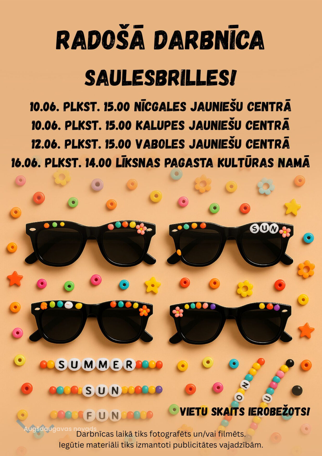 Vasaras sajūtu pilna darbnīca, kurā pārvērtīsim parastas saulesbrilles par īstiem mākslas darbiem – ar pērlītēm, ziediņiem un košām krāsām!