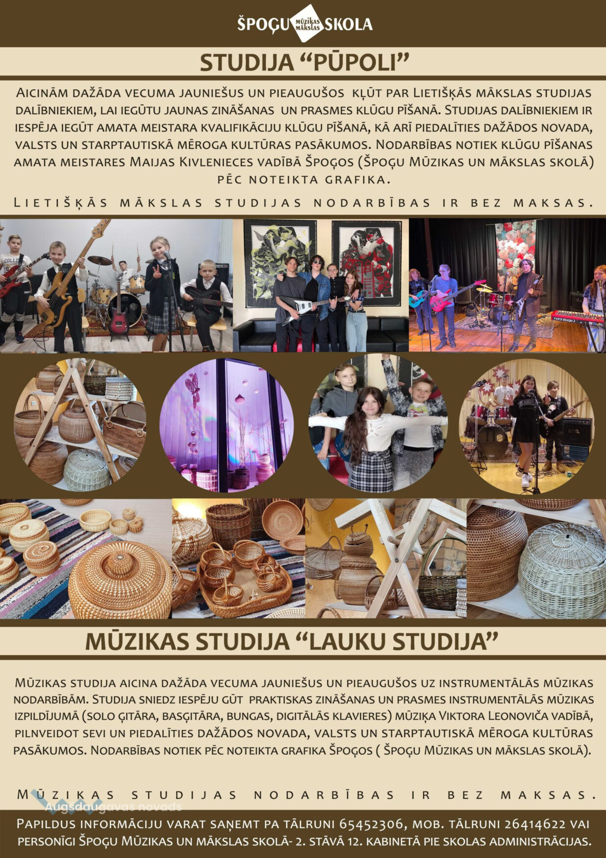 vai personīgi Špoģu Mūzikas un mākslas skolā – 2. stāvā 12. kabinetā pie skolas administrācijas.