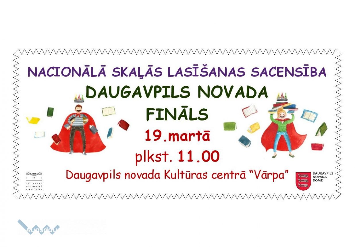 19. martā plkst. 11.00 Daugavpils novada Kultūras centrā „Vārpa” notiks Nacionālās Skaļās lasīšanas sacensību Daugavpils novada fināls, kuru vadīs Latvijas skaļās lasīšanas sacensības čempione un Latvijas Nacionālās bibliotēkas (LNB) bērnu direktore Inna Ivanova no Naujenes pagasta. Finālā tiksies novada skaļākie lasītāji, lai noskaidrotu, kurš pārstāvēs mūsu novadu Skaļās lasīšanas sacensībās nacionālajā finālā Rīgā 9. maijā!