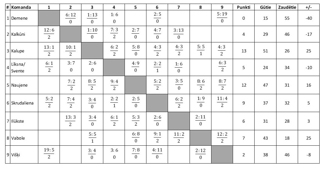 Pēc čempionāta nolikuma tiks izspēlēts viena apļa pamatturnīrs starp deviņām komandām, no kurām astoņas labākās komandas izspēlēs ceturtdaļfināla izslēgšanas spēles, pēc kā tiks noskaidroti turnīra uzvarētāji. Spēļu rezultātus var vērot pievienotajā tabulā. Čempionāta spēles notiek Špoģu vidusskolas sporta zālē.