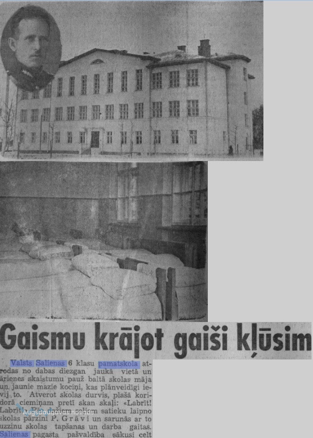 "Valsts Salienas 6. klašu pamatskola atrodas no dabas diezgan jaukā vietā un ārienes skaistumu pauž baltā skolas māja un jaunie mazie kociņi, kas plānveidīgi ievij to. Atverot skolas durvis, plašā koridorā ciemiņam pretī skan skaļi: «Labrīt! Labrīt!» Pēc dažiem soļiem satieku laipno skolas pārzini P. Grāvi un sarunās ar to uzzinu skolas tapšanas un darba gaitas. Salienas pagasta pašvaldība sākusi celt skolu 1929. gadā. Darbi turpinājušies lēni un līdzekļu trūkuma dēļ beidzot būve pa visam pārtraukta. 1934. gadā skolas tālāko būvi pārņēmusi izglītības ministrija un tā būvdarbus nobeigusi 1938. gada vasarā. 9. oktobrī skolu iesvētija. Pagasta pašvaldība un sabiedriskās organizācijas dāvājušas skolai karogu ar devīzi: «Gaismu krājot, gaiši kļūsim». Skolas būve izmaksājusi 200 000 latu. Skolā iekārtotas 10. klases. Šogad skolā mācas 310 skolnieku, no tiem daudzi sveštautiešu bērni. Strādā 10 štata skolotāji un četri atsevišķu priekšmetu pasniedzēji. Skolas iekšējais telpu sadalijums un iekātrojums atbilst visām prasībām. Klases ērtas, gaišas un siltas. Priekšzīmīgas arī kopmītņu telpas. Vienā istabā guļ 30 zēni, bet otrā — 45 meitenes. Guļamistabās valda spodrība un priekšzīmīga kārtība. Gultām baltlinu palagi un vienādas glītas segas, kopgaldā piedalās 97 proc. skolnieku. Trūcīgie skolnieki pusdienas saņem par brīvu, bet pārējiem tās izmaksā 13 santimu. No koridora pa ērtām kāpnēm nonākam mājas trešā stāvā, kurā plašs koridors pieved lielām durvīm ar uzrakstu «zāle». Tā izbūvēta ar 250 sēdvietām un ir lielākā visā pagastā. Iekārtota arī skatuve. Stundu starpbrīžos skolnieki sapulcējās zālē, kur uzkavējās dežūrējošā skolotāja uzraudzībā. Garākos starpbrīžos skolnieki mācas tautiskas rotaļas. Zāli izmanto arī pagasta sabiedriskas organizācijas kulturālām vajadzībām. Pēdējos gados skolas trūcīgākiem un centīgākiem skolniekiem par izglītības ministrijas līdzekļiem izsniegti apavi. Tos izsniedzot stingri ievērots, lai pabalstāmie bērni būtu bijuši visu vasaru nodarbināti piemērotos darbos uz laukiem. Tekošā gadā apavus saņēma 50 bērni. Skolas pārziņa kabinetā pie sienas redzamas mūsu Tautas Vadoņa un kara ministra glīti ierāmētas ģīmetnes. Klases telpu sienas grezno daudzas mūsu valsts un seno kultūras darbinieku ģīmetnes. Skolas ārienas izdaiļošanā centīgā skolas pārziņa lietpratīgā vadībā veikts dižs darbs. Katru rudeni un pavasari vairākas dienas pēc mācībām skolniekus nodarbina pie skolas apkārtnes un parka izveidošanas. Te lielu palīdzību snieguši arī bērnu vecāki un pagasta pašvaldība, dodot bez maksas šķūtis. Pagājušā gadā skolas apkārtnē norakta un pārvietota zeme vairāk kā 1000 kubikmetru un paveikti lieli izdaiļošanas darbi. Nesen skolai piešķīra 19 ha zemi. To kultivēs un izmantos skolas un skolotāju vajadzībai. Pie skolas nepārtraukti kopš 1930. gada darbojas lauksaimniecības rakstura papildskola. To apmeklē vairums pamatskolas beigušie, lauksaimnieces un lauksaimnieki. Vērojams, ka sabiedrības interese par to vairojas. Tekošā gadā pie skolas noorganizēts arī pieaugušo pilsoņu koris. Tajā piedalās vairāk kā 50 dziedātāju. Kori vada skolotājs P. Lejnieks, un pašlaik dziedātāji gatavojas Latgales dziesmu svētkiem. Atvadoties no laipnā skolas pārziņa P. Grāves tas man piekodināja par viņu nerakstīt. Tomēr nevaru neteikt, ka viņš Salienā nostrādājis jau 15 gadus. Viņš ir Ilūkstes aizsargu pulka rotas komandieris» Salienas mazpulka vadītājs, vietējās patērētāju biedrības valdes loceklis, lauksaimniecības biedrības biedrs un darbojas vēl citās biedrībās. Viņš pazīstams arī kā centīgs lopkopis un labs biškopis. Viņam pieder ražīgākās govis pagastā un 14 stropu liela bišu drava. Ar darbu un sirsnību viņš iemantojis vietējās sabiedrības simpātijas un drošu ticību turpmākam darbam."