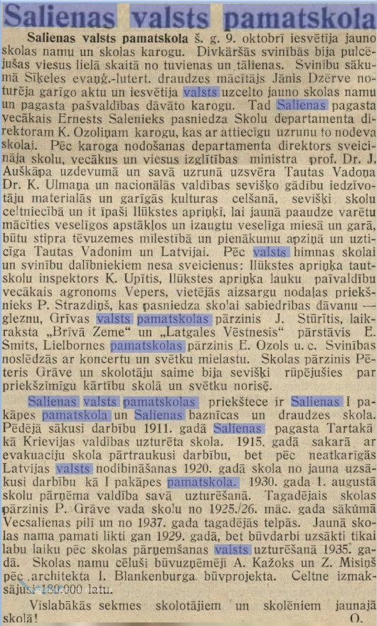 "Salienas valsts pamatskola š. g. 9. oktobrī iesvētīja jaunskolas namu un skolas karogu. Divkāršas svinības bija pulcējušas viesus lielā skaitā no tuvienas un tālienas. Svinību sākumā Sīķeles evaņģ.- lutert. draudzes mācītājs Jānis Dzērve noturēja garīgo aktu un iesvētija valsts uzcelto jauno skolas namu un pagasta pašvaldības dāvāto karogu. Tad Salienas pagasta vecākais Ernests Salenieks pasniedza Skolu departamenta direktoram K. Ozoliņam karogu, kas ar attiecīgu uzrunu to nodeva skolai. Pēc karoga nodošanas departamenta direktors sveicināja skolu, vecākus un viesus izglītības ministra prof. Dr. J. Auškāpa uzdevumā un savā uzrunā uzsvēra Tautas Vadoņa Dr. K. Ulmaņa un nacionālās valdības sevišķo gādību iedzīvotāju materiālās un garīgās kultūras celšanā, sevišķi skolu celtniecībā un it īpaši Ilūkstes apriņķī, lai jaunā paaudze varētu mācīties veselīgos apstākļos un izaugtu veselīga miesā un garā būtu stipra tēvuzemes mīlestībā un pienākumu apziņā un uzticīga Tautas Vadonim un Latvijai. Pēc valsts himnas skola un svinību dalībniekiem nesa sveicienus: Ilūkstes apriņķa tautskolu inspektors K. Upītis, Ilūkstes apriņķa lauku pašvaldību vecākais agronoms Vepers, vietējās aizsargu nodaļas priekšnieks P. Strazdiņš, kas pasniedza skolai sabiedrības dāvanu — gleznu, Grīvas valsts pamatskolas pārzinis J. Stūrītis, laikraksta „Brīvā Zeme" un „Latgales Vēstnesis" pārstāvis E. Smits, Lielbornes pamatskolas pārzinis E. Ozols u. c. Svinība noslēdzās ar koncertu un svētku mielastu. Skolas pārzinis Pēteris Grāve un skolotāju saime bija sevišķi rūpējušies pa priekšzīmīgu kārtību skolā un svētku norisē. Salienas valsts pamatskolas priekštece ir Salienas I pakāpes pamatskola un Salienas baznīcas un draudzes skola. Pēdējā sākusi darbību 1911. gadā Salienas pagasta Tartakā kā Krievijas valdības uzturēta skola. 1915. gadā sakarā ar evakuāciju skola pārtraukusi darbību, bet pēc neatkarīgās Latvijas valsts nodibināšanas 1920. gadā skola no jauna uzsākusi darbību kā I pakāpes pamatskola. 1930. gada 1. skolu pārņēma valdība savā uzturēšanā. Tagadējais skolas pārzinis P. Grāve vada skolu no 1925./1926. māc. gada sākuma Vecsalienas pilī un no 1937. gada tagadējās telpās. Jaunā skolas nama pamati likti gan 1929. gadā, bet būvdarbi uzsākti tika labu laiku pēc skolas pārņemšanas valsts uzturēšanā 1935. gadā. Skolas namu cēluši būvuzņēmēji A. Kažoks un Z. Misiņš pēc architekta I. Blankenburga būvprojekta. Celtne izmaksājusi 180 000 latu."