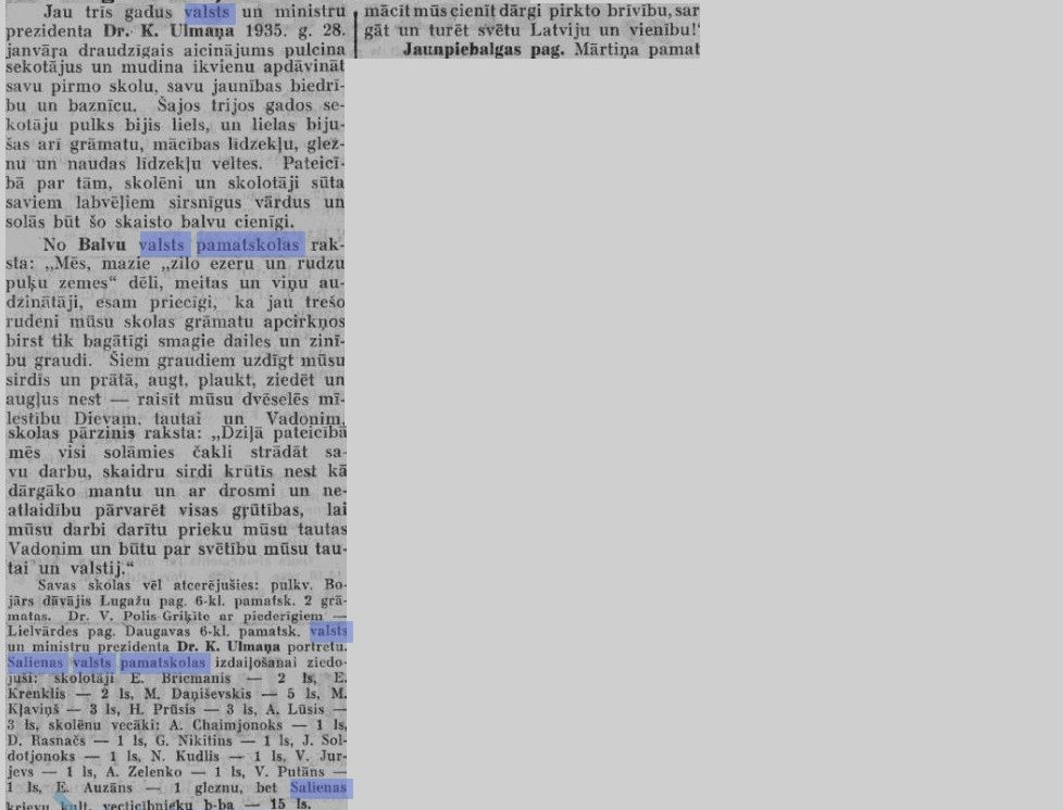 Jau trīs gadus valsts un ministru prezidenta Dr. K. Ulmaņa 1935. g. 28. janvāra draudzīgais aicinājums pulcina sekotājus un mudina ikvienu apdāvināt savu pirmo skolu, savu jaunības biedrību un baznīcu. Šajos trijos gados sekotāju pulks bijis liels, un lielas bijušas arī grāmatu, mācības līdzekļu, gleznu un naudas līdzekļu veltes. Pateicībā par tām, skolēni un skolotāji sūta saviem labvēļiem sirsnīgus vārdus un solās būt šo skaisto balvu cienīgi. Salienas valsts pamatskolas izdaiļošanai ziedojuši: skolotāji E. Bricmanis — 2 ls, E. Krenklis — 2 ls, M. Daņiševskis — 5 ls, M. Kļaviņš — 3 ls, H. Prūsis — 3 ls, A. Lūsis — 3 ls, skolēnu vecāki: A. Chaimjonoks — 1 ls, D. Rasnačs — 1 ls, G. Nikitins — 1 ls, J. Soldotjonoks — 1 ls, N. Kudlis — 1 ls, V. Jurjevs — 1 ls, A. Zelenko — 1 ls, V. Putāns — 1 ls, E. Auzāns — 1 gleznu, bet Salienas krievu kult. vecticībnieku b-ba — 15 ls.