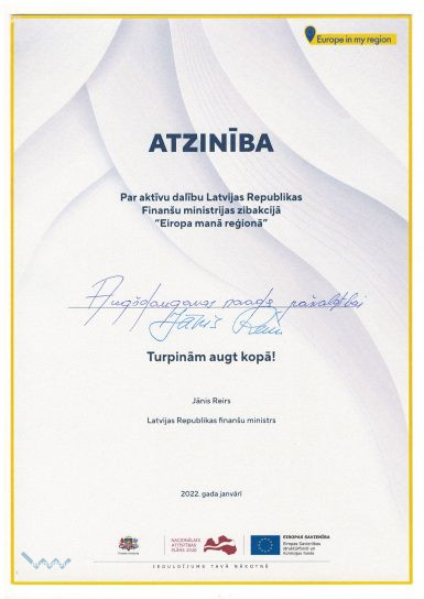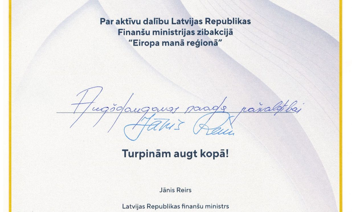 Augšdaugavas novada pašvaldība ir saņēmusi LR finanšu ministra Jāņa Reira Atzinību par aktīvu dalību Latvijas Republikas Finanšu ministrijas zibakcijā “Eiropa manā reģionā”.