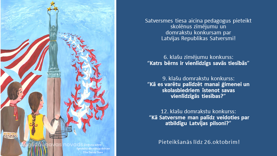Izglītības un zinātnes ministrija aicina piedalīties Satversmes tiesas zīmējumu un domrakstu konkursā par Latvijas Republikas Satversmi. Konkurss notiek jau ceturto reizi. Pedagogi ir aicināti pieteikt skolēnus konkursam līdz 26. oktobrim, aizpildot pieteikuma anketu.