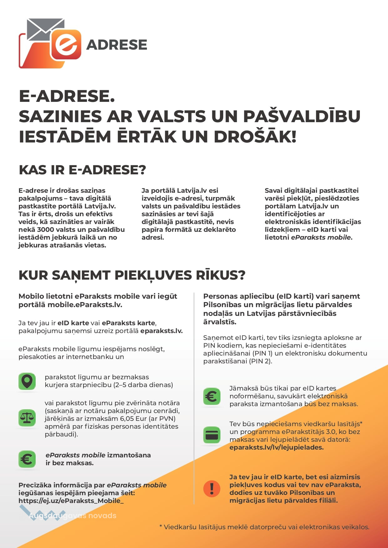 Savai digitālajai pastkastītei varēsi piekļūt, pieslēdzoties portālam Latvija.lv un identificējoties ar elektroniskiem līdzekļiem – eID karti vai lietotni eParaksts mobile.