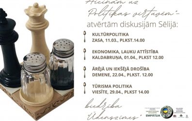 Martā un aprīlī dažādās Sēlijas vietās notiks 4 klātienes diskusiju cikls “Politikas virtuves”, kurā valsts un pašvaldību speciālisti, uzņēmēji, nevalstisko organizāciju aktīvisti un kopienu līderi spriedīs, kā uzlabot dzīves kvalitāti Sēlijā. Četrās “Politikas virtuvēs” tiks pārrunāta kultūrpolitika, ekonomika un lauku attīstība, valsts iekšējā un ārējā drošība, kā arī tūrisma politika Sēlijā. Savu dalību diskusijā pieteikuši … Continue reading Sēlijā notiks diskusiju cikls “Politikas virtuves”