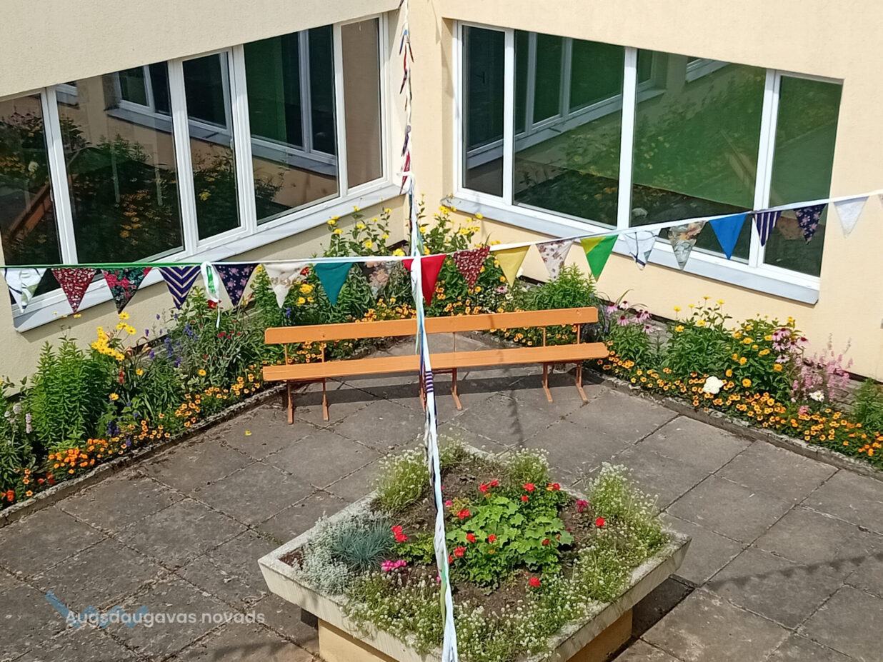 Pateicoties trim jaukām, gadīgām un prasmīgām saimniecēm, šī puķu dobe varēja tapt un priecēt skolas darbiniekus, iemītniekus un apmeklētājus. Tamdēļ sakām milzīgu paldies skaisto dārzu saimniecēm: Indrai Madarniecei, Daigai Kalniņai un Silvijai Baginskai. Jūs dāvātie stādiņi ir izauguši un snieguši patiesu prieku daudziem. Jūsu ziedi ir priecējuši un turpina priecēt daudzu mēnešu garumā un piešķīruši skolas iekšpagalma pelēcībai krāsas un krāšņumu. Jūsu ieguldījums ir novērtēts, paldies jums par to!