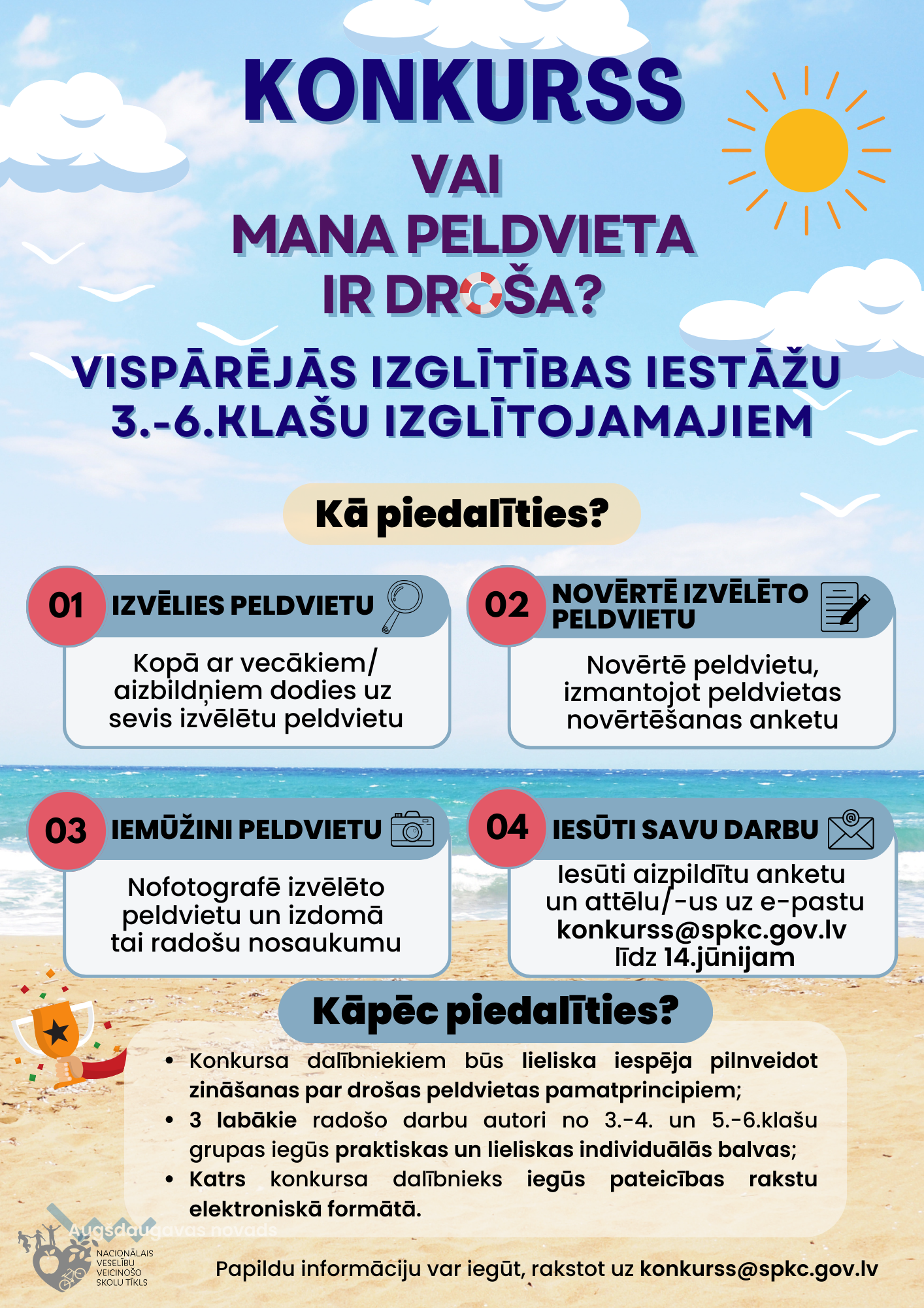 Lai veicinātu izglītojamo izpratni par drošas peldvietas pamatprincipiem un rosinātu izglītojamos un viņu vecākus/aizbildņus izvērtēt drošības apstākļus bērna izvēlētajā peldvietā, aicinām vispārējās izglītības iestāžu 3.–6.klašu izglītojamos līdz 14.jūnijam piedalīties konkursā “Vai mana peldvieta ir droša?”.
