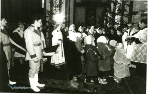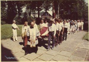 Vaboles LTF nodaļas karoga iesvētīšana Vissvētās Jēzus Sirds Romas katoļu baznīcā 1990.gada 23.decembrī. Foto no J.Ragela ģimenes arhīva. Fotogrāfs: J.Luberts