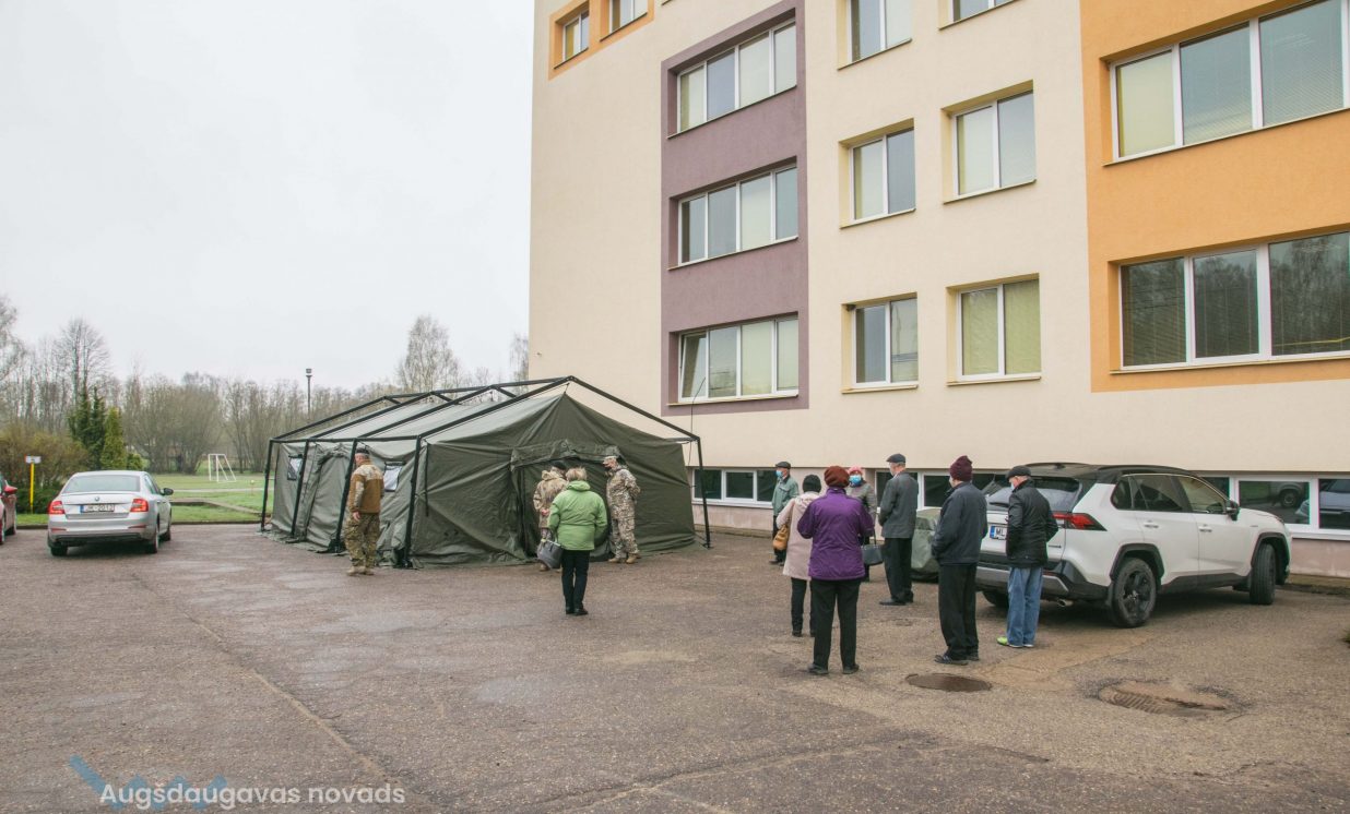 Atbalstu vakcinācijas punktam sniedz zemessargi, organizējot iedzīvotāju plūsmu pie telts ieejas. Aizsardzības nozare palīdz arī ar mobilajiem vakcinācijas punktiem, tostarp teltīm, transportu un vakcīnu loģistiku.