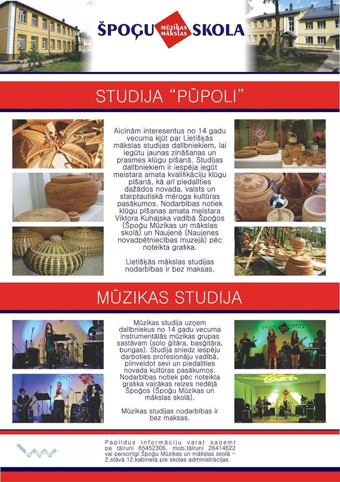 Papildus informāciju var saņemt: pa tālruni 654 52306, mob.tālruni 26414622 vai personīgi Špoģu Mūzikas un mākslas skolā – 2.stāvā 12.kabinetā pie skolas administrācijas.