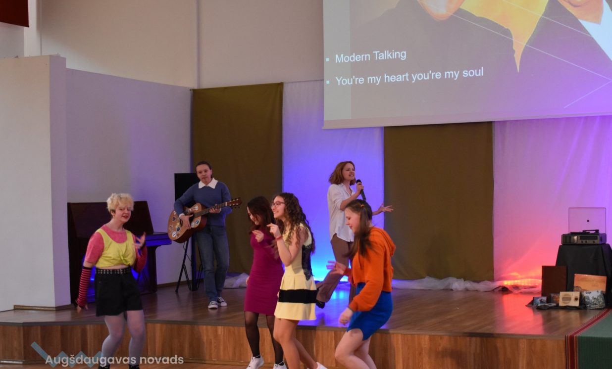 80.- tos gadus ar dziesmām no grupas Modern Talking "You're My Heart, You're My Soul" un Maikla Džeksona "Bad" pārstāvēja 7.a klase.
