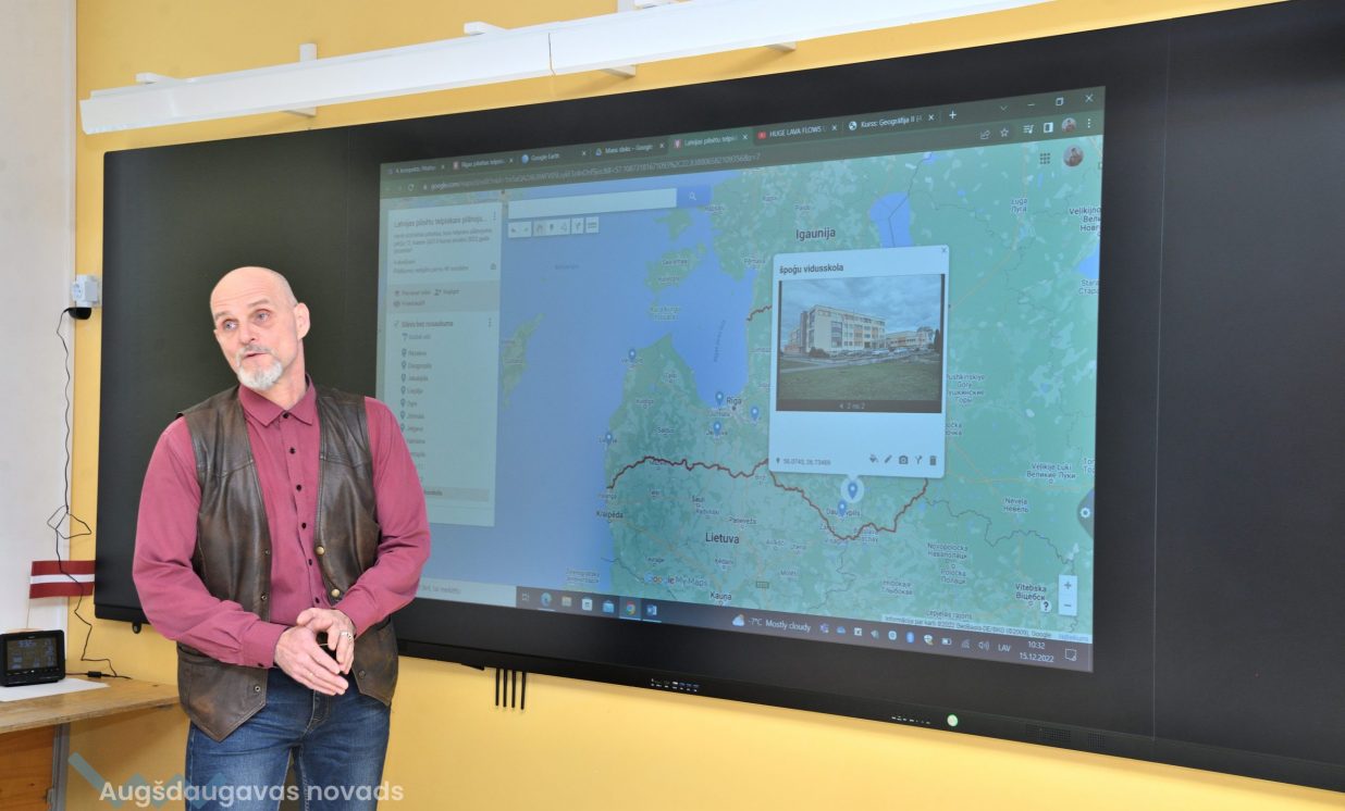 Ģeogrāfijas kabinetā ir pieejama jaunā interaktīvā tāfele, neliela meteostacija un personīgie datori katram skolēnam. Ģeogrāfijas priekšmetā tas ļauj izmantot digitālās karšu sistēmas. Stundā tiek strādāts ar ĢIS sistēmu un Google Maps, veidojot dažādas kartes. Jānis Suveizda, ģeogrāfijas, vēstures un bioloģijas skolotājs: “Ģeogrāfijas maize, tā ir karšu veidošana. Jaunieši apgūst, kā savu materiālu vai pētījumu papildināt ar paša veidotu karti. Arī apgūst, kā analizēt kartes un iegūt informāciju no tām. Tagad vairāk izmantojam digitālās kartes.”