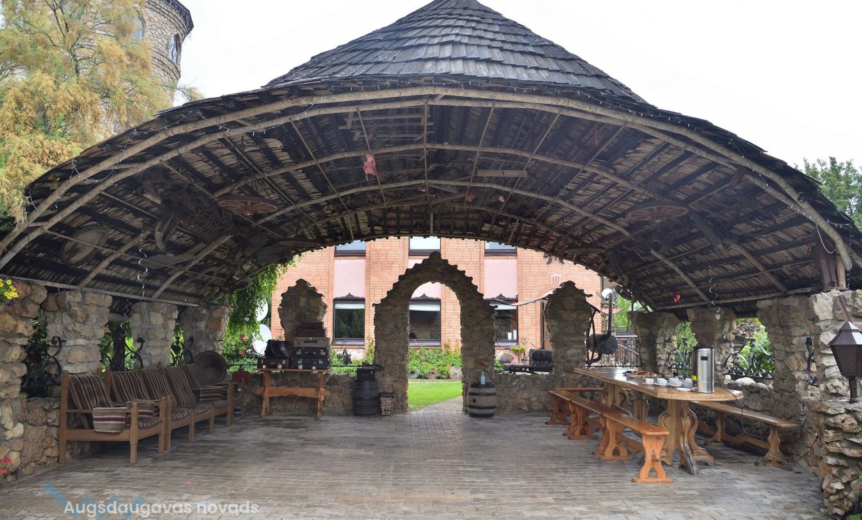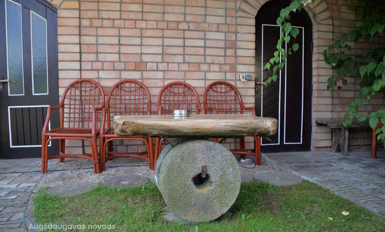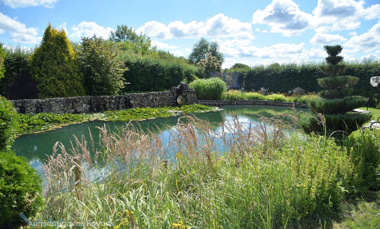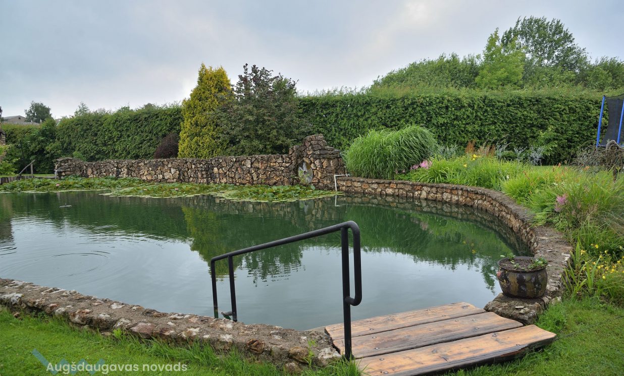 Pagalma vidū liels dīķis, kurā zied ūdensrozes un plunčājas dažādu krāsu zivis. Kādreiz tā vietā bijis purvains neapsaimniekots zemes gabals. Biruta stāsta, ka astoņdesmito gadu beigās bijusi iespēja dabūt savā īpašumā sešas simtdaļas no blakus esošas zemes, kas nebija izmantojama kā atsevišķs apbūves gabals. Tā purva vietā tapa sešus metrus dziļš dīķis. “Kamēr dīķis piepildījās, visu apkārtni bijām uz laiku atstājuši bez ūdens, kaimiņi nāca pie mums pēc ūdens lopiņiem,” atceras saimniece. Rokot dīķi atklājies, ka te atrodami gan ārstnieciskie pelēkie māli, sarkanie, no kuriem var ķieģeļus taisīt.