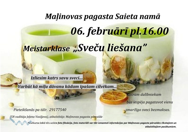 6. februārī plkst. 16.00 Maļinovas Saieta nams aicina pagasta iedzīvotājus uz sveču liešanas radošu darbnīcu. Tā ir lieliska iespēja caur aktīvu mācīšanos apgūt jaunas iemaņas. Katram dalībniekam būs iespēja pagatavot vienu smaržīgu sveci bezmaksas. Pieteikšanās pa tālr. 29177540.